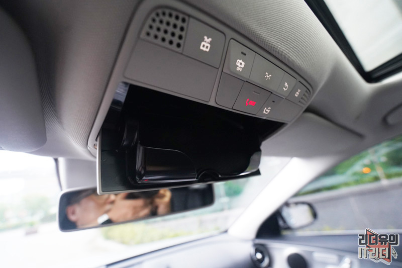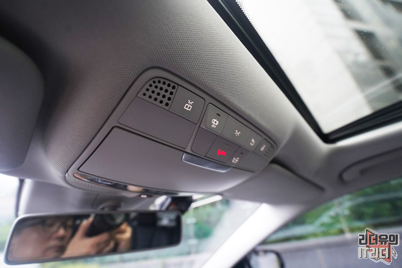 위에는 선루프 컨트롤 스위치가 있고 SOS 버튼도 있습니다. 그리고 선글라스 수납공간도 있습니다.