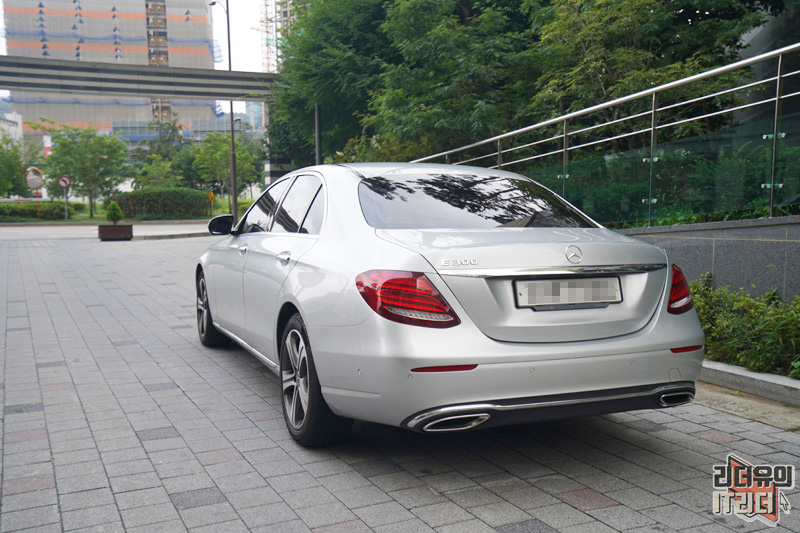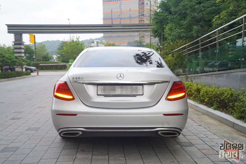 벤츠 E클래스 e300 후면 모습입니다. 벤츠 E클래스 디자인에서 가장 아쉬운 부분이라 할 수 있는데요. 너무 심심한 디자인이고 차가 작아 보이는 테일램프로 벤츠 E클래스의 고급스러운 매력을 살리지 못하고 있습니다. 그리고 벤츠 C클래스도 유사한 디자인이라 사실상 디자인으로 두 차를 구분하기는 쉽지 않습니다.