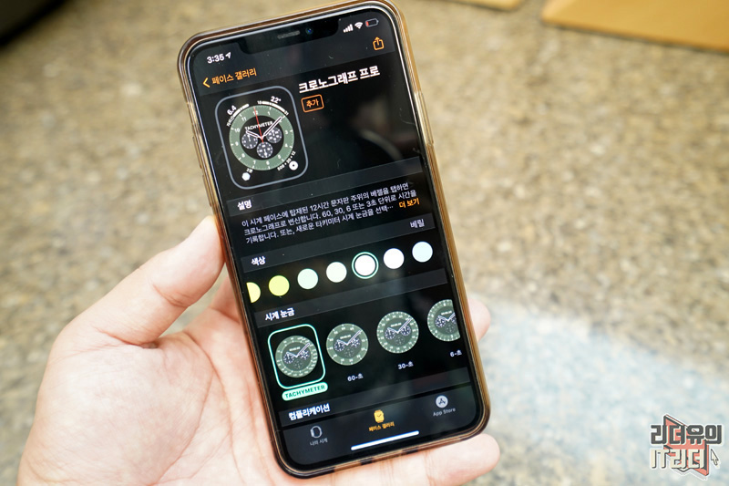 업데이트를 하면 새로운 워치페이스 크로노그래프 프로를 만날 수 있습니다. 커스터마이징 가능한 타키미터가 포함되어 있습니다.