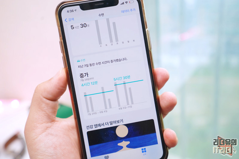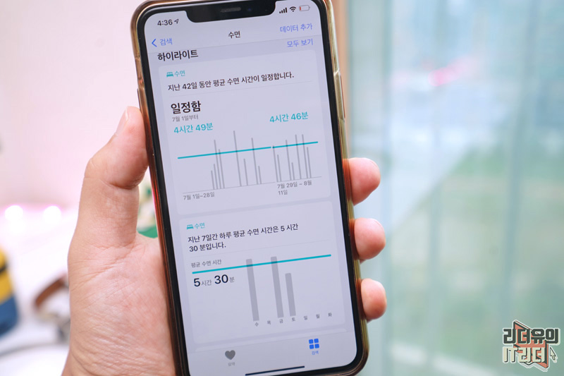 수면 추적은 아이폰 건강앱에서 관리가 됩니다. 정교한 데이터로 건강한 수면을 할 수 있도록 유도하고 있으니 더욱 만족스러운 애플 워치를 만나게 될 것입니다.