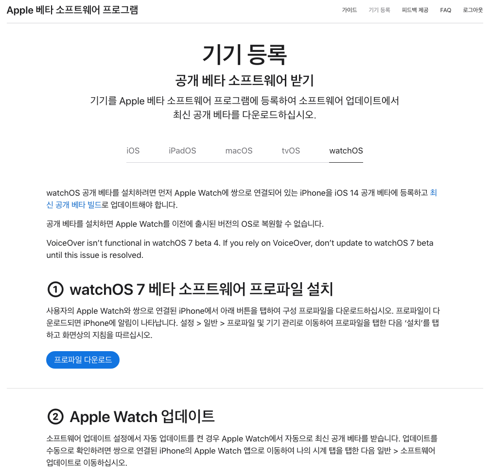먼저 기기등록을 해주셔야 합니다. 중요한 포인트는 애플워치 wathOS 7을 사용하려면 필히 iOS 14 베타 소프트웨어를 업데이트 해야 한다는 것입니다. 그래야 watchOS 7도 이용 가능합니다.