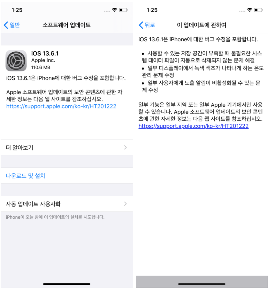 아이폰 iOS 13.6.1 달라진점은 큰 변화 보다는 버그가 수정되었습니다. 사용할 수 있는 저장 공간이 부족할 때 불필요한 시스템 데이터 파일이 자동으로 삭제되지 않는 문제가 해결되었고 일부 디스플레이에서 녹색 색조가 나타나게 하는 온도 관리 문제도 수정되었습니다.
