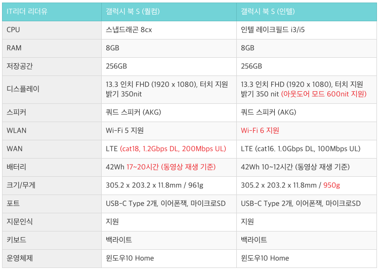 LTE 되는 노트북 갤럭시 북 S 스냅드래곤 8cx 모델이 탑재된 건 인텔 CPU가 들어간 모델 대비 뭐가 좋을까요? 스펙 차이는 다음과 같습니다.