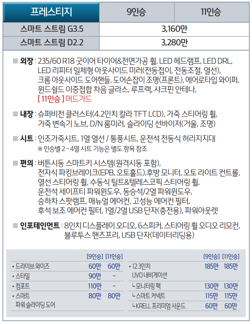 신형 카니발은 두가지 파워트레인을 가지고 있습니다. 가솔린 3.5와 디젤 2.2인데요. 승차감이나 편안함에서는 당연히 스마트스트림 G3.5가 좋지만 유지비 부담이 꽤 크다고 보시면 됩니다. 3,500cc 이기 때문에 세금도 많이 나오고 연비도 복합연비가 9.1km/l 밖에 되지 않습니다. 반면 스마트스트림은 2,200cc라 세금 저렴하고 연비도 13.1km/l나 나옵니다. 패밀리 SUV는 가성비도 무시할 수 없기 때문에 조금 승차감을 포기하더라도 스마트스트림 D2.2가 좋은 선택이 될 것입니다.