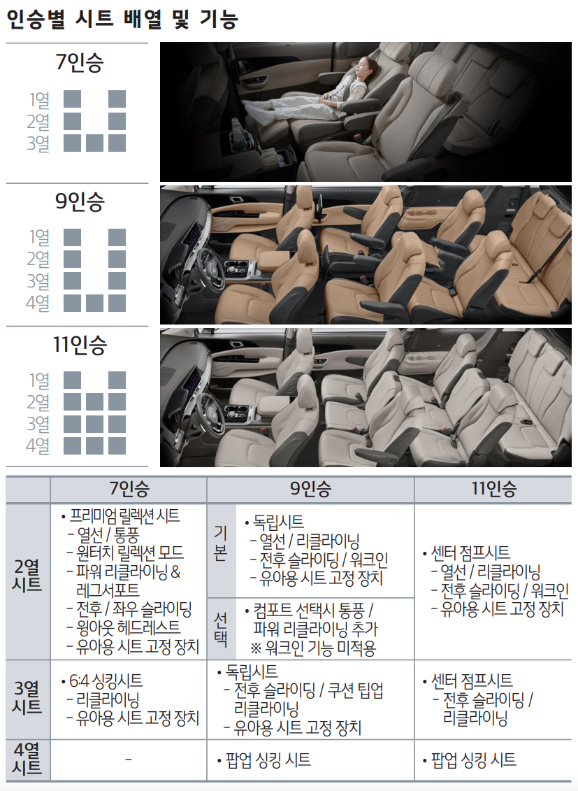 9인승, 11인승은 아무래도 많은 사람들을 태우기 위해 자리를 촘촘하게 만들었기 때문에 7인승을 선택해야 여유로운 실내 공간을 누리면서 신형 카니발을 제대로 느낄 수 있을 것입니다.