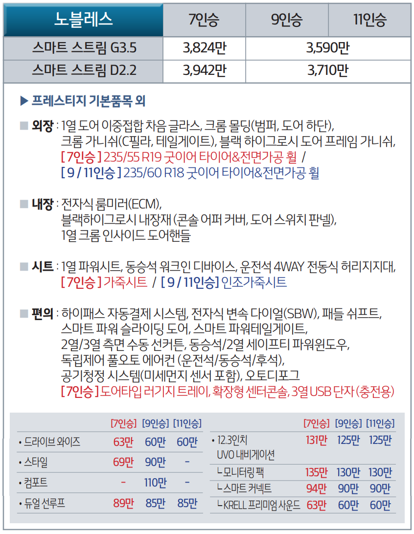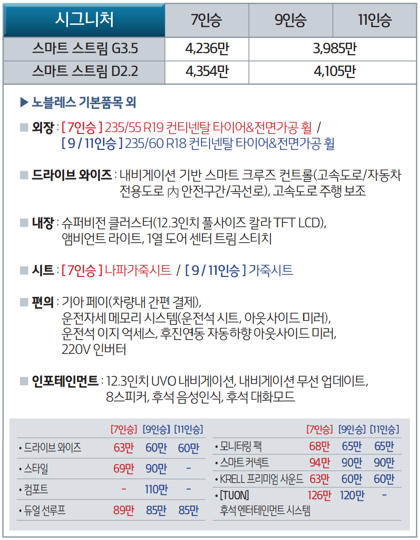 신형 카니발은 두가지 파워트레인을 가지고 있습니다. 가솔린 3.5와 디젤 2.2인데요. 승차감이나 편안함에서는 당연히 스마트스트림 G3.5가 좋지만 유지비 부담이 꽤 크다고 보시면 됩니다. 3,500cc 이기 때문에 세금도 많이 나오고 연비도 복합연비가 9.1km/l 밖에 되지 않습니다. 반면 스마트스트림은 2,200cc라 세금 저렴하고 연비도 13.1km/l나 나옵니다. 패밀리 SUV는 가성비도 무시할 수 없기 때문에 조금 승차감을 포기하더라도 스마트스트림 D2.2가 좋은 선택이 될 것입니다.