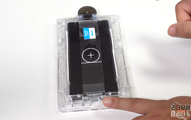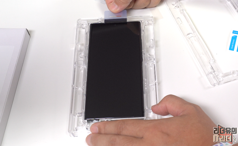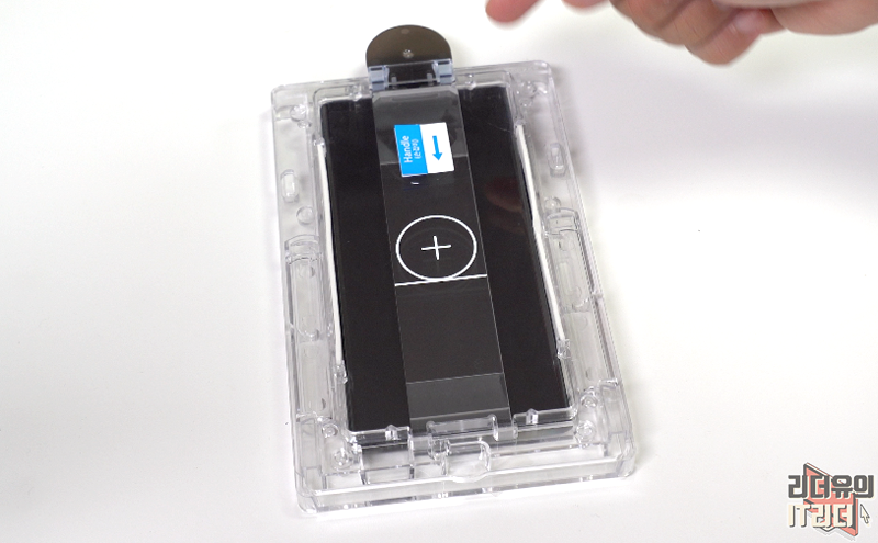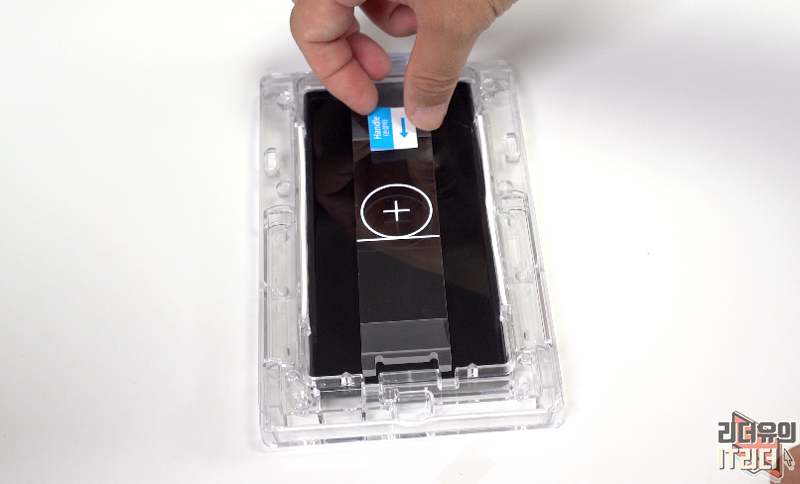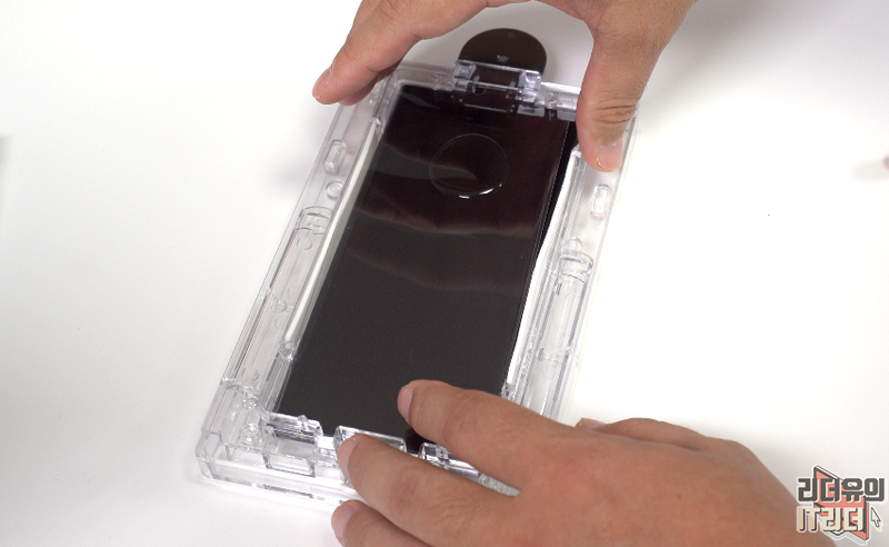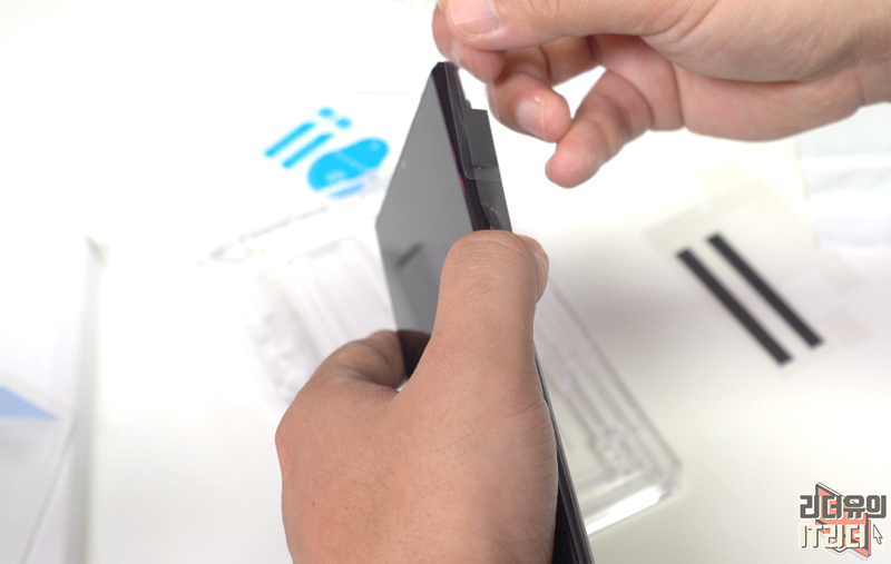 상단 영역도 카메라 부분을 제외하고 완벽하게 보호하고 있습니다. 트레이에서 부착하는 방식이라 똥손도 부착이 가능합니다.