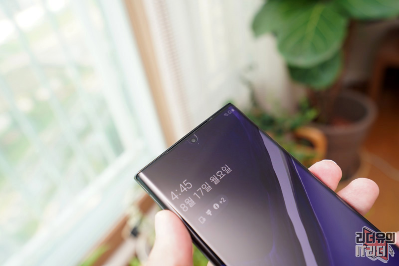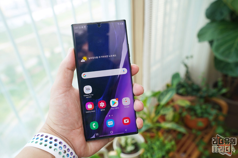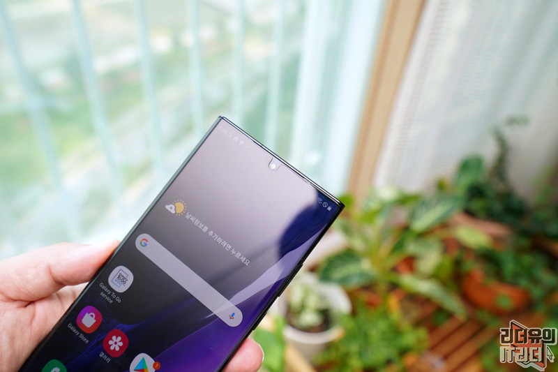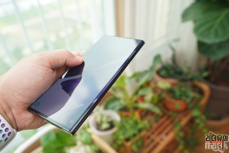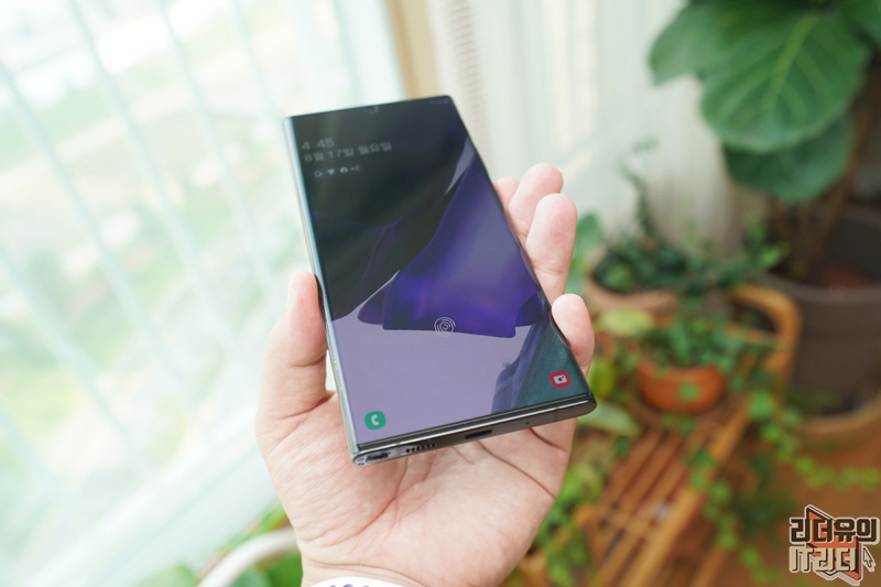 갤럭시노트20 울트라 돔글라스 부착이 완료된 모습입니다. 아래까지 완벽하게 커버하고 있는 것을 알 수 있습니다.