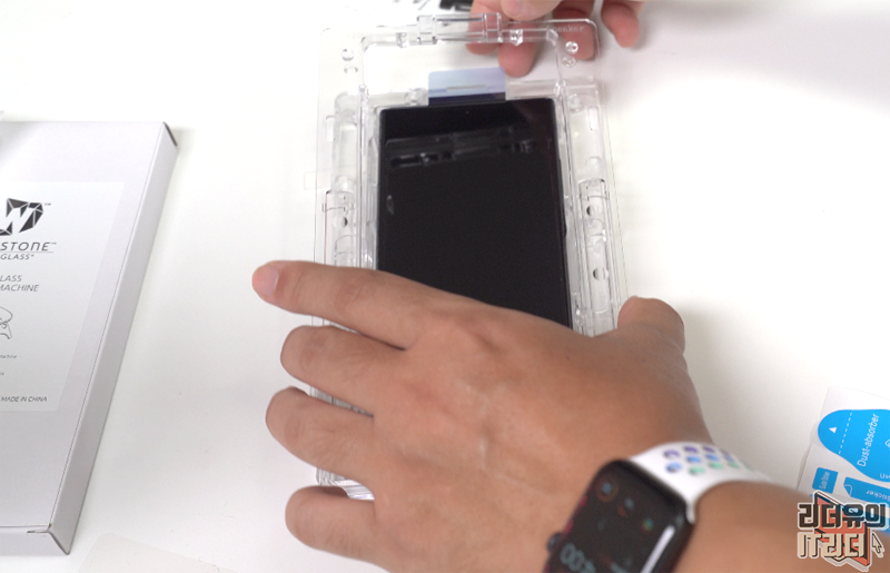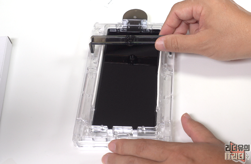 상단 핀을 제거하면 강화유리가 아래로 내려가면서 경화액이 위아래로 쫙 퍼지게 됩니다. 다 퍼질때까지 기다린 후 가이드바를 분리하면 됩니다.