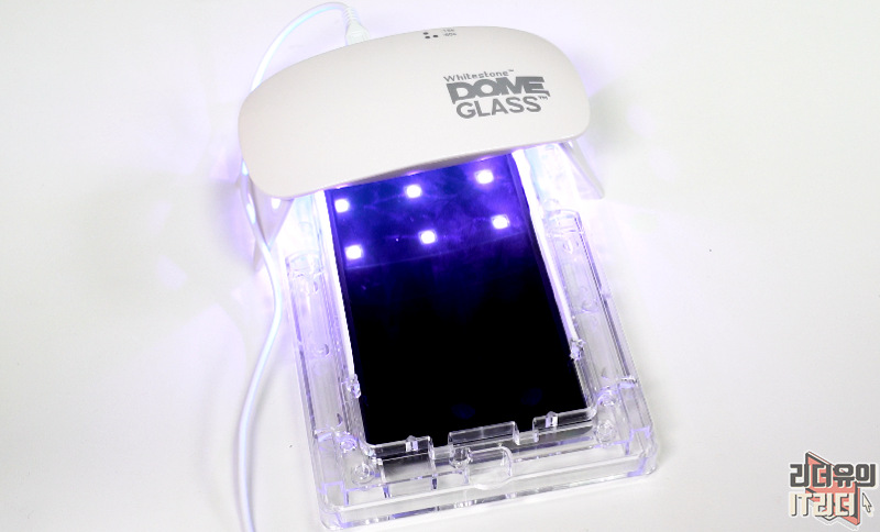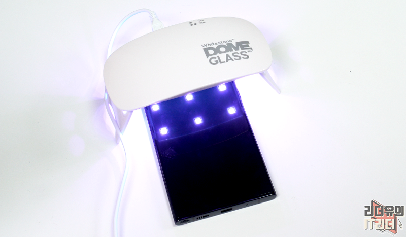 여기서 주의사항으로 절대 트레이에서 갤럭시노트20 울트라를 분리하시면 됩니다. 경화액을 1차로 굳혀줘야 된다는 점 꼭 잊지 마시기 바랍니다. 경화액은 아직 액체 상태라서 트레이에서 빼면 강화유리가 이탈 할 수 있습니다. 그래서 1차 경화를 시키고 분리해야 합니다.