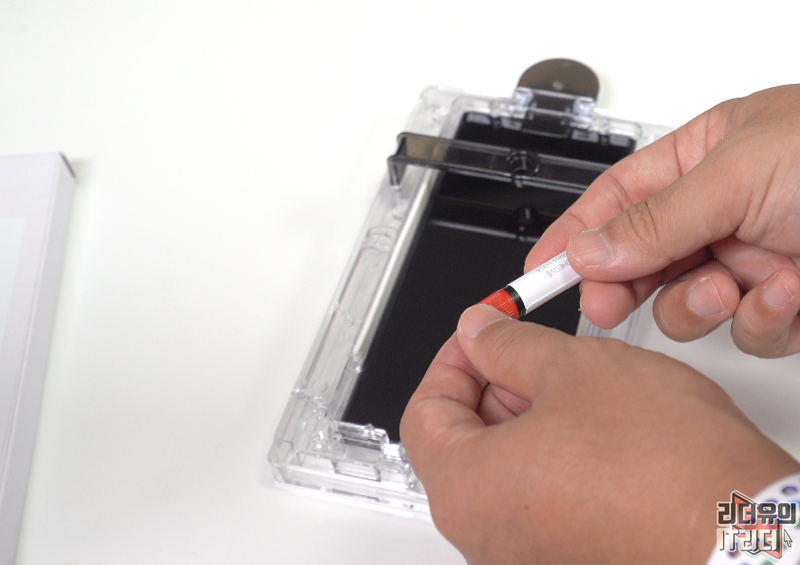 상단 수화부에 마스킹 테이프를 부착합니다. 기존에는 눈대중으로 해야 했는데 이번엔 트레이에 홈이 있어 거기에 맞춰서 부착하면 아주 쉽게 부착할 수 있습니다.