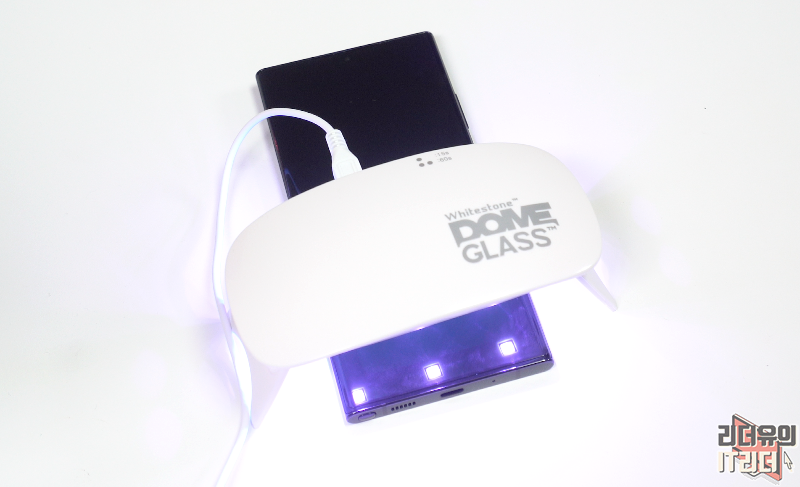 여기서 주의사항으로 절대 트레이에서 갤럭시노트20 울트라를 분리하시면 됩니다. 경화액을 1차로 굳혀줘야 된다는 점 꼭 잊지 마시기 바랍니다. 경화액은 아직 액체 상태라서 트레이에서 빼면 강화유리가 이탈 할 수 있습니다. 그래서 1차 경화를 시키고 분리해야 합니다.