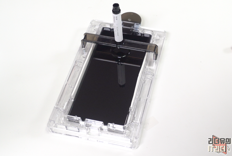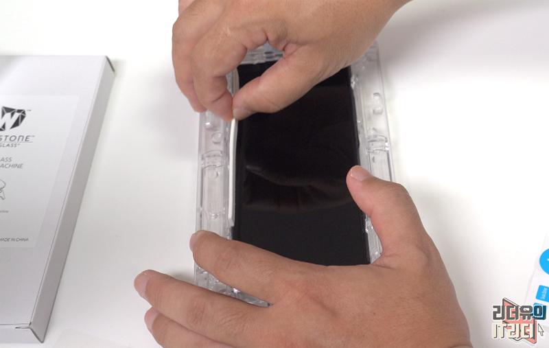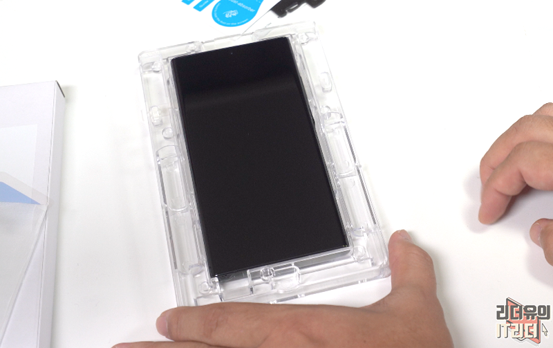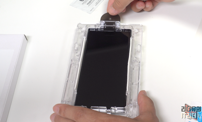 상단 영역도 카메라 부분을 제외하고 완벽하게 보호하고 있습니다. 트레이에서 부착하는 방식이라 똥손도 부착이 가능합니다.
