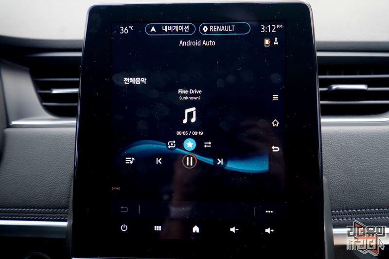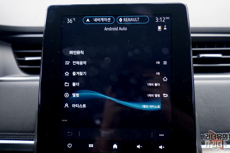 음악 재생 화면입니다. MP3 파일을 담아 재생도 가능하고 스트리밍 음악 서비스도 이용할 수 있습니다. 그런데 이것도 굳이 필요 없는 기능이죠. 일반 차에 다 지원을 하는 기능이기 때문입니다. 안드로이드 오토가 지원되는 수준의 차라면 기본 지원합니다.