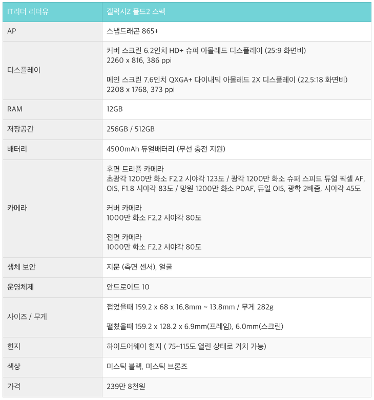 갤럭시Z 폴드2 스펙과 가격입니다. 갤럭시폴드1과 달리 전체적으로 단점을 지적할게 없을 정도로 다 보완된 스펙을 가지고 있습니다. 완성형 갤럭시Z 폴드2 입니다.