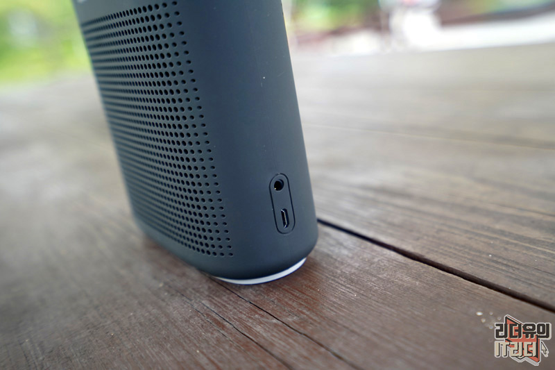 오른쪽 하단부틀 보면 3.5mm Aux in 단자가 있고 마이크로 5핀 충전 단자가 있습니다. 완충 시 최대 사용 시간은 8시간 입니다. 야외에서 충분히 배터리 걱정없이 이용할 수 있는 사용 시간이라 보시면 됩니다