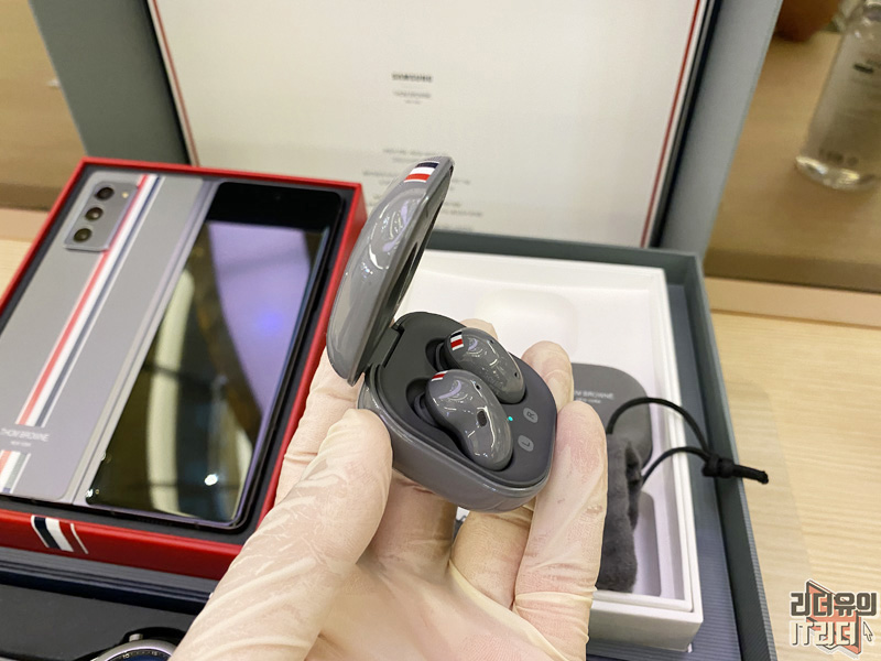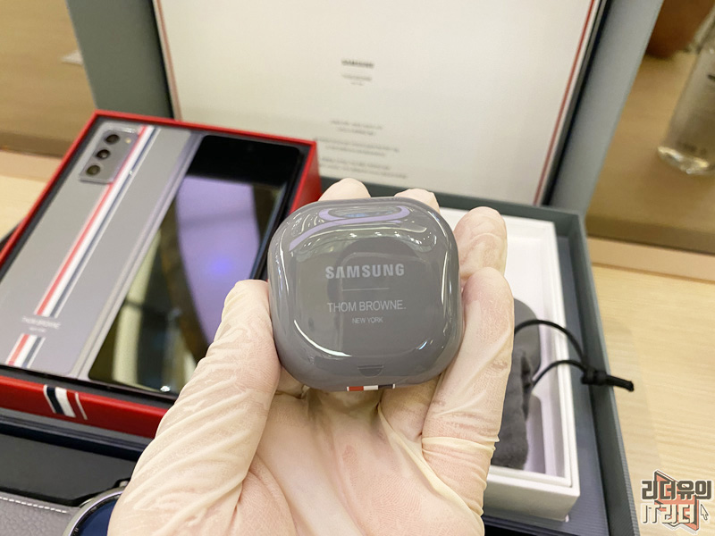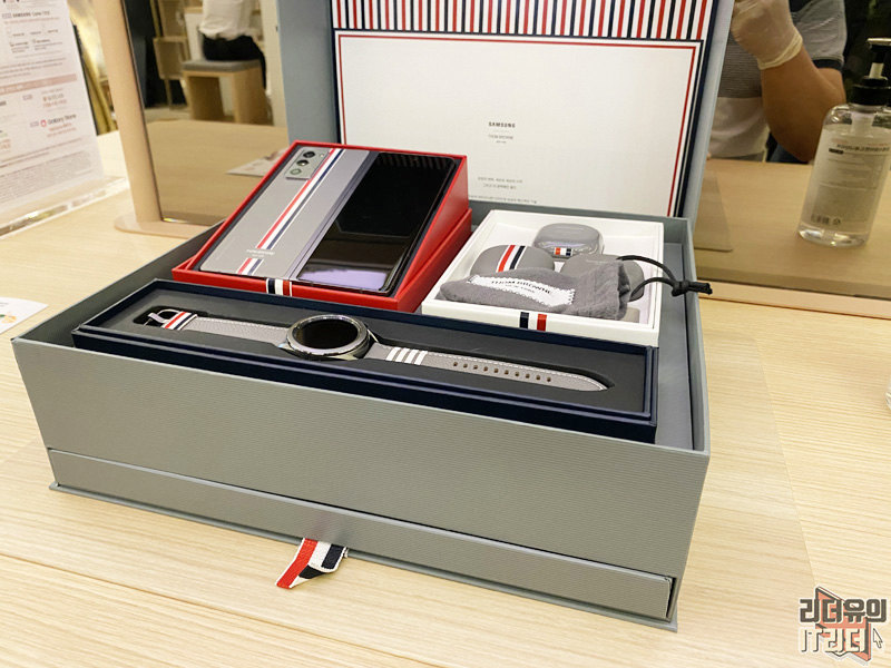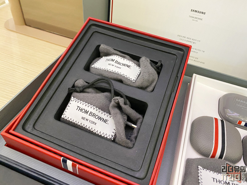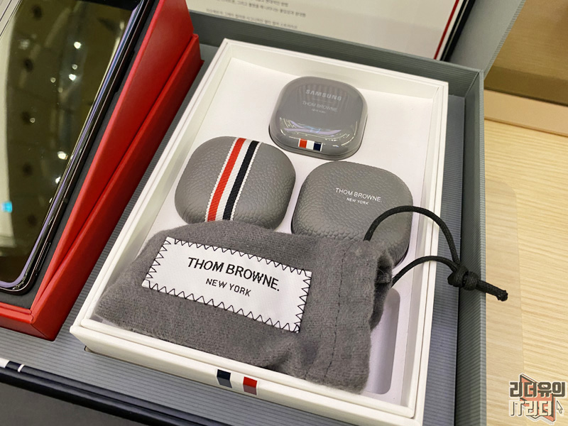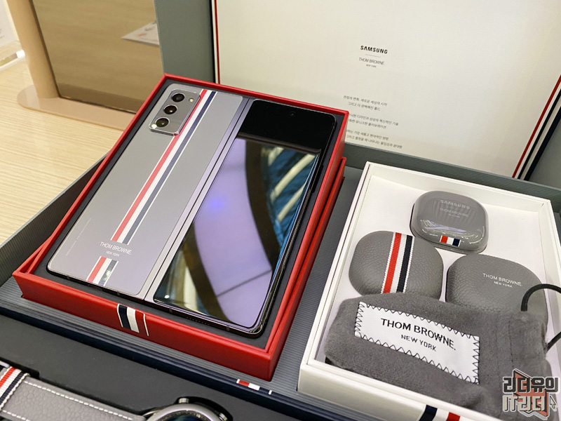 갤럭시Z 폴드2 톰브라운 에디션 패키지 입니다. 톰브라운의 시그니처 수트 컬러 회색을 베이스로 했고 빨간색, 흰색, 파란색 패턴의 섬유 소재를 사용해 톰브라운을 상징하고 있습니다.