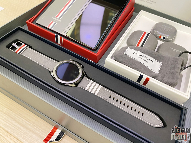 갤럭시 워치3는 블랙 박스에 담겨 있습니다. 기존보다 톰브라운 에디션임을 더 강조하는 디자인을 볼 수 있습니다.