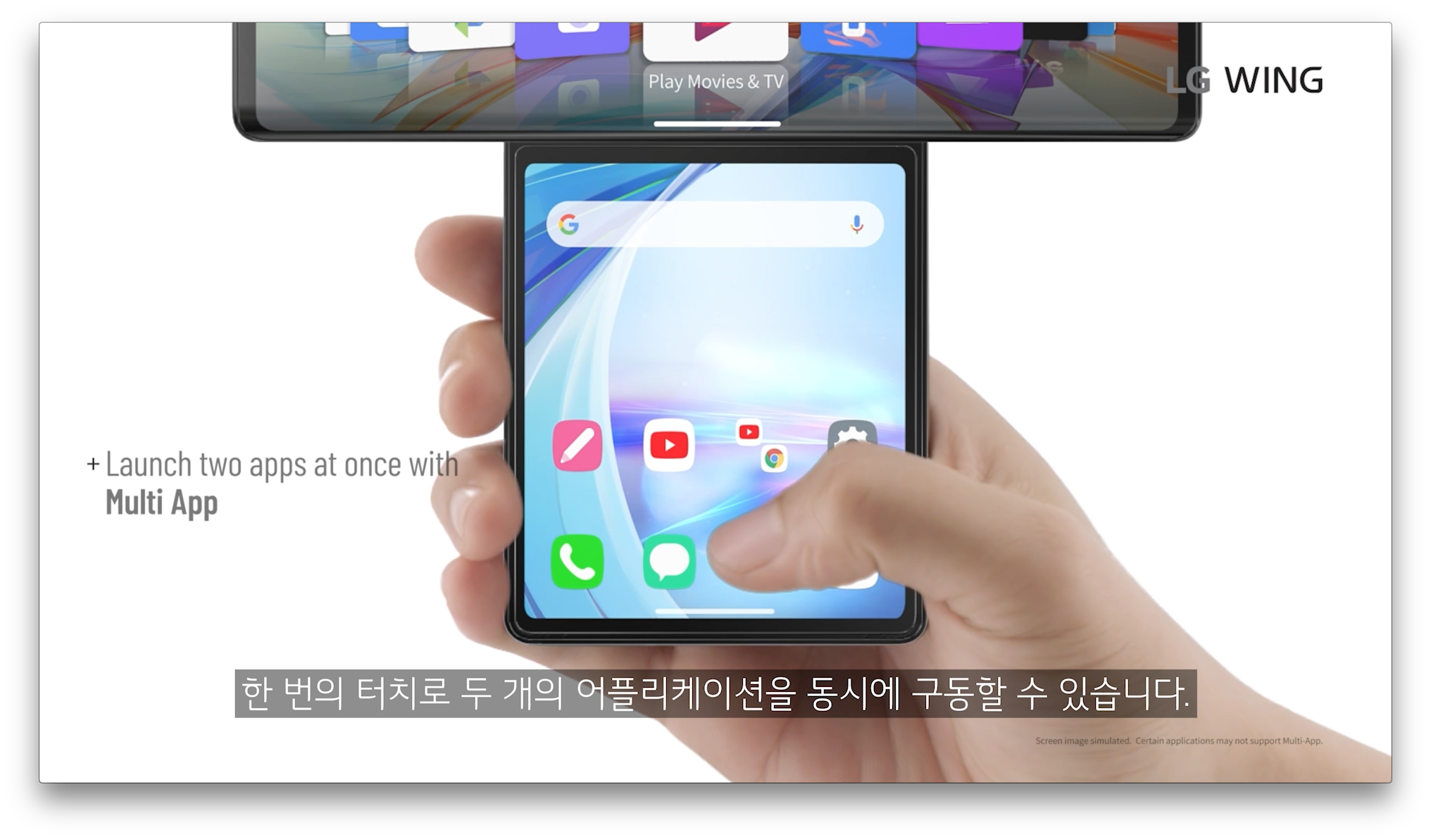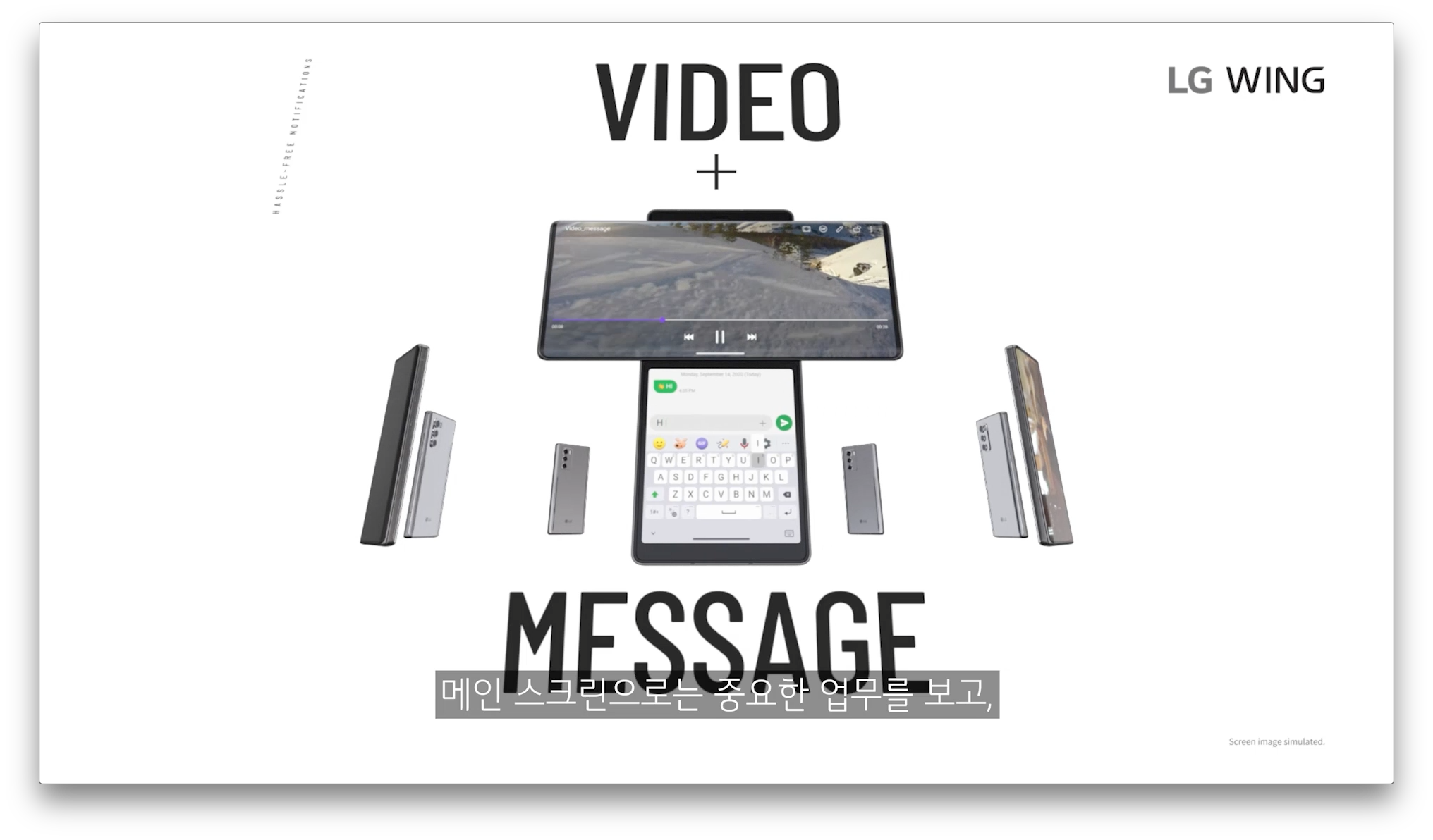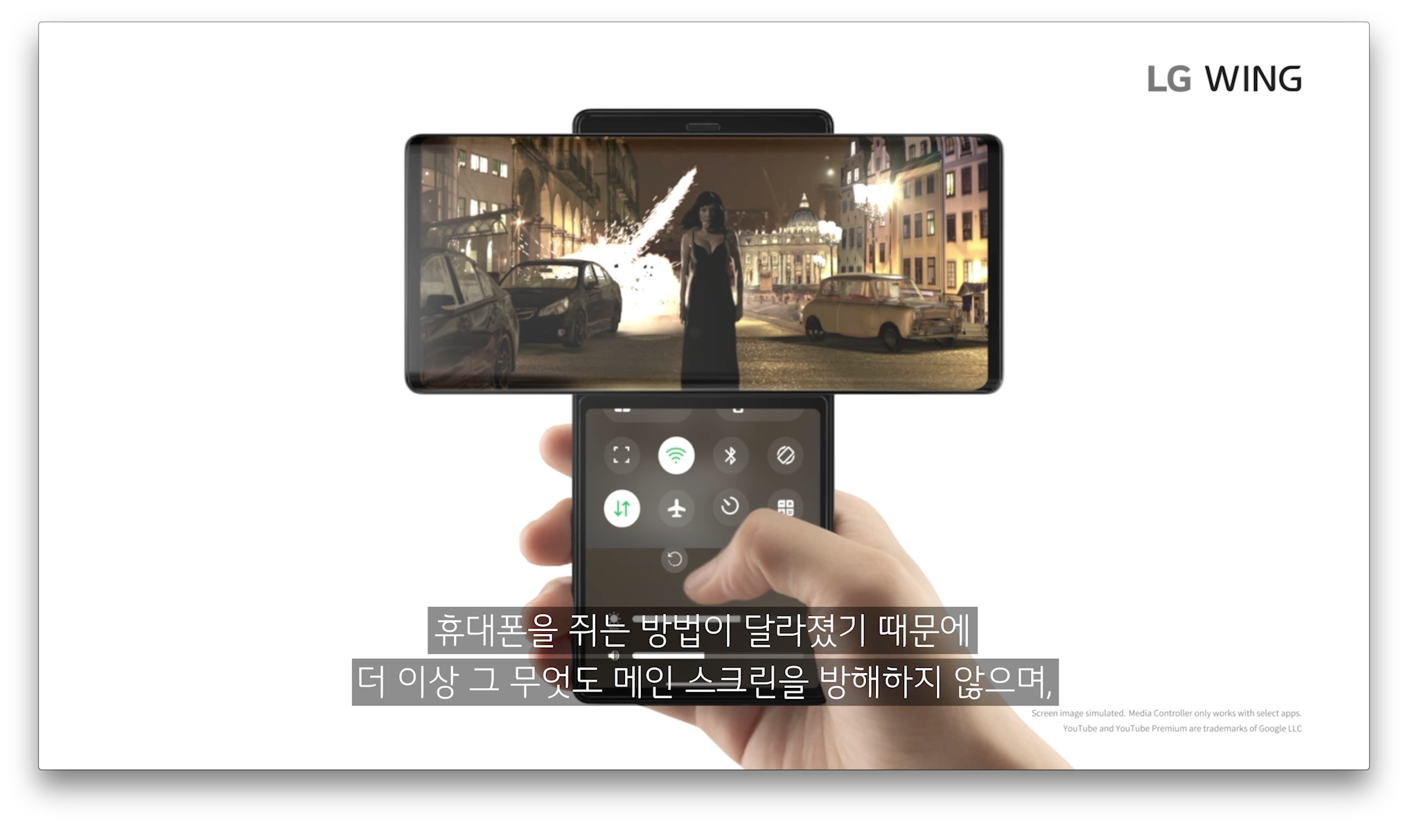 LG 윙의 가장 큰 매력은 손으로 들었을때 화면을 가리지 않는 다는 것입니다. 우리가 평상시 스마트폰을 들고 영상을 보면 화면을 어쩔수 없이 가리게 되는데요. LG 윙은 그런 부분에서 자유로운 매력을 제시했습니다.