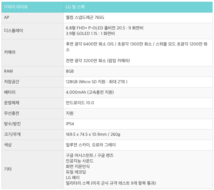 LG 윙 스펙 입니다. AP가 스냅드래곤 765G로 탑재된 것이 아쉬운 부분이지만 가격적인 부분을 고려한 선택이라 보입니다. 참고로 765G도 일반적인 사용씬에서는 결코 느린 AP는 아니니 걱정하지 않으셔도 됩니다.