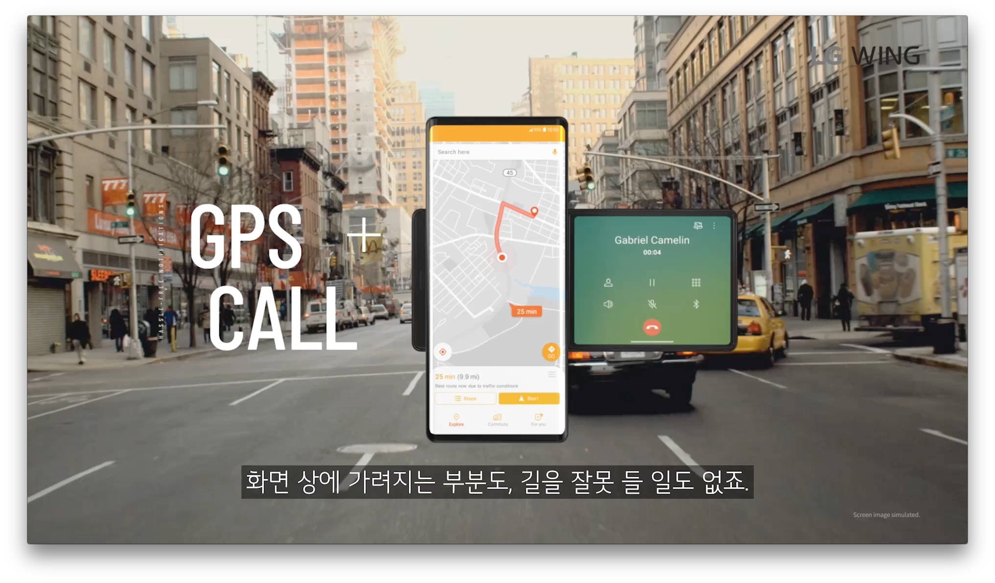 그리고 다양한 멀티 사용에 대한 매력을 제시했습니다. 내비게이션 이용하면서 전화 따로 사용하기, 게임 도중 받해 받지 않으면서 알림 보기, 카메라 사용시 방해 받지 않으면서 알림 보기, 영상 보면서 문자 보내기 등 우리가 평상시 경험했던 불편한 사용씬들을 LG 윙이 해소해 주고 있습니다.
