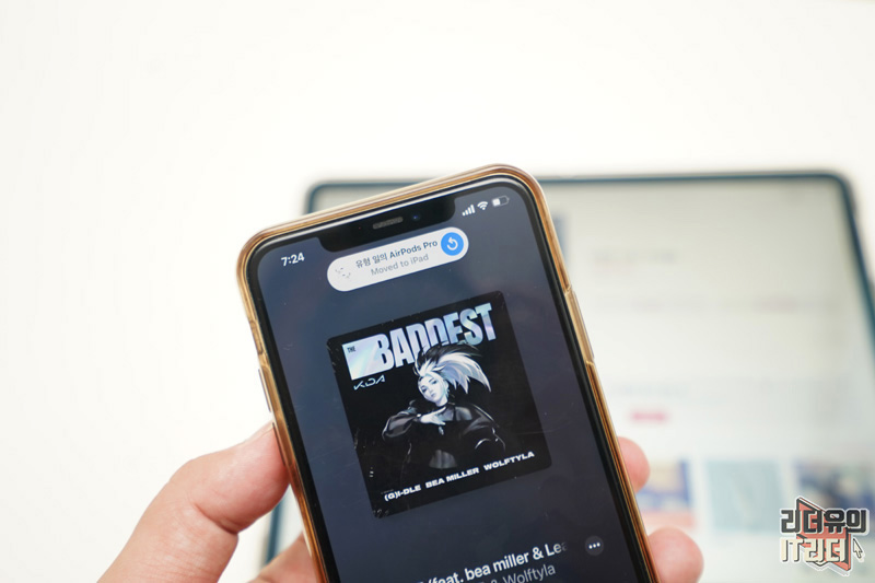 아이폰에서 듣다가 아이패드에서 음악 감상을 하면 아이패드에서 에어팟 프로를 사용한다고 알림을 볼 수 있습니다.