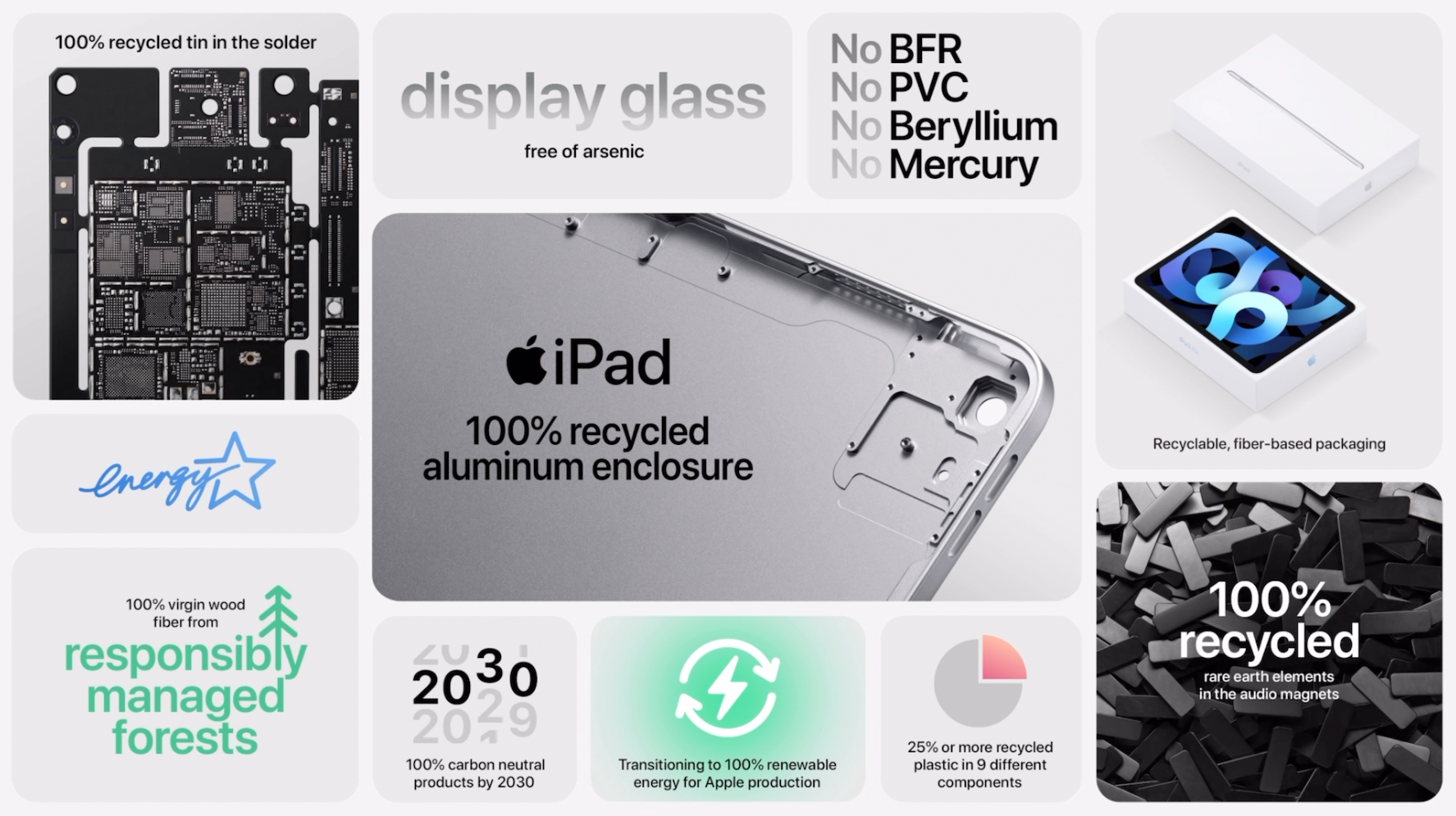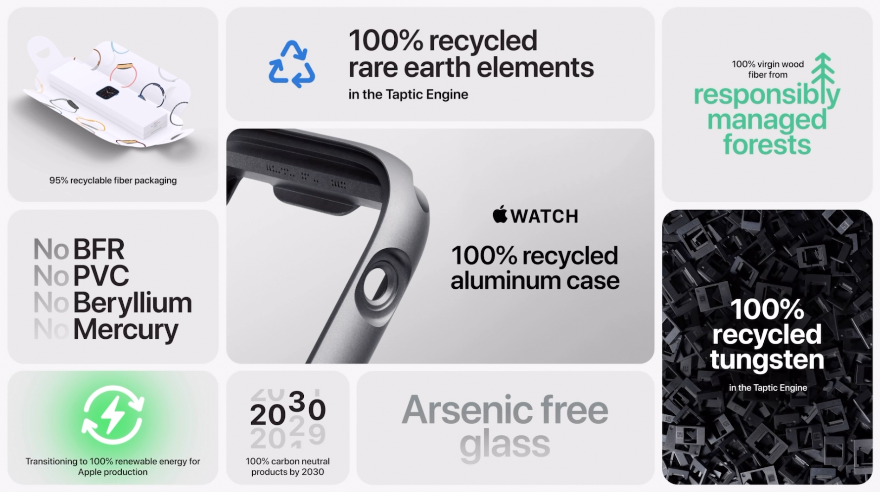 제품을 만드는 소재에도 환경을 고려한 소재가 사용되고 있습니다. 100% 재활용 알루미늄 사용, 애플워치 시리즈6에 들어간 탭틱엔진은 100% 재활용한 희토류 원소와 텅스텐을 사용했습니다. 그리고 환경에 안좋은 BFR, PVC, 베릴륨, 수은을 애플은 사용하지 않고 있고 디스플레이 유리에도 비소를 사용하지 않는 철저함을 보여주고 있습니다. 포장재도 재활용된 자원이거나 책임 있게 관리된 숲에서 얻는다고 합니다.