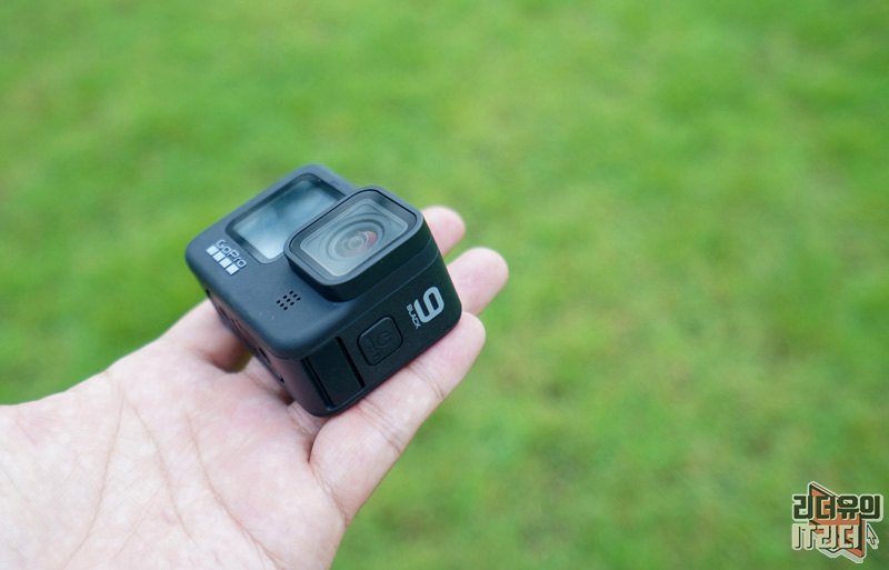 사이즈는 전작 고프로 히어로8 블랙 보다 커졌습니다. 전체적인 디자인은 크게 달라지지 않았고 내장 마운트가 있는 구조이고 자체 10m 방수를 지원해 정말 편하게 사용할 수 있습니다.