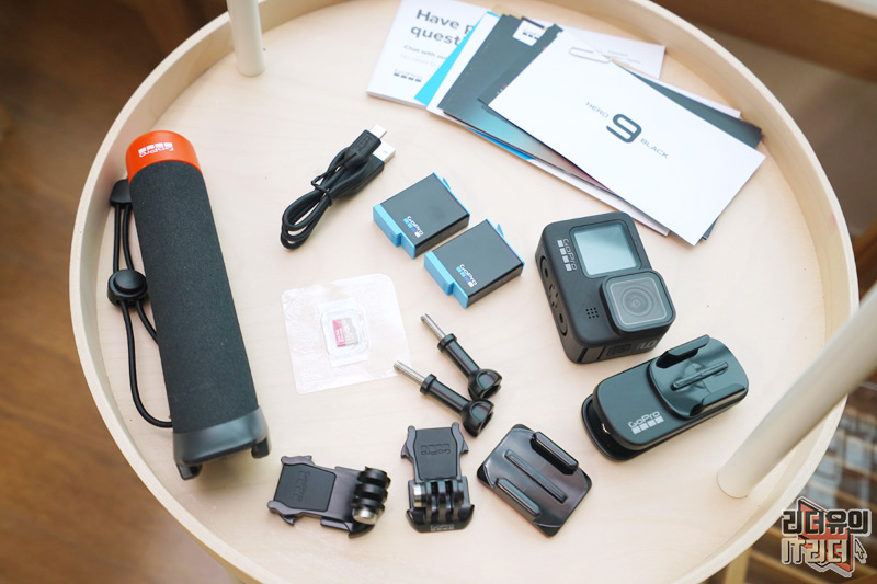 고프로 히어로9 블랙은 두가지 선택지가 있습니다. 기본 패키지와 번들 패키지! 제가 사용한건 번들 패키지로 마운트와 악세서리를 기본 제공하고 있습니다. 물가에서 사용 가능한 플로팅 그립, 최근에 나온 마그네틱 스위블 클립, 추가 배터리, Micro SD 카드 32GB와 다양한 마운트가 여행용 케이스에 제공됩니다. 활용도가 아주 좋습니다.