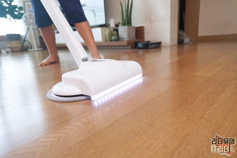 물걸레를 부착하면 이런 느낌입니다. 물걸레가 크기 때문에 청소를 빠르고 쉽게 할 수 있습니다. 분당 300rpm으로 초고속 회전하게 됩니다. 다른 물걸레 청소기 대비 더 빠르게 회전하기 때문에 실제 사용해 보시면 한번 지나가면 끝입니다. 힘 주지 않고 그냥 밀고 다니면 됩니다.