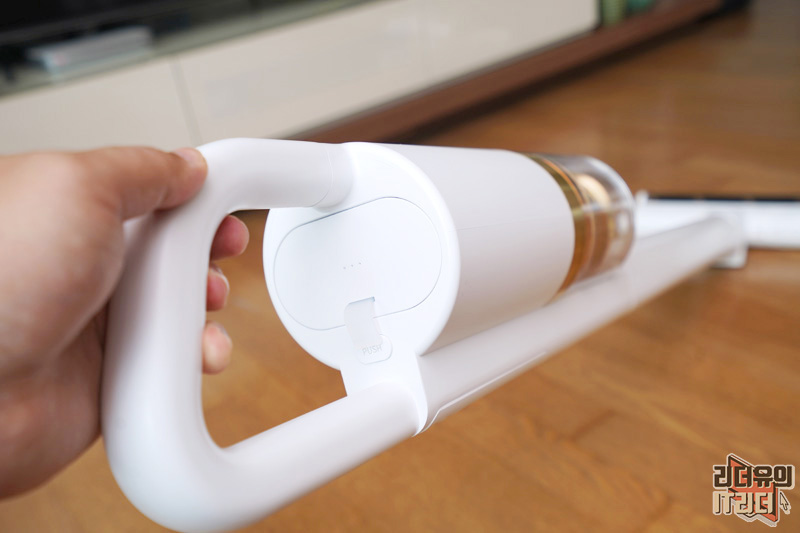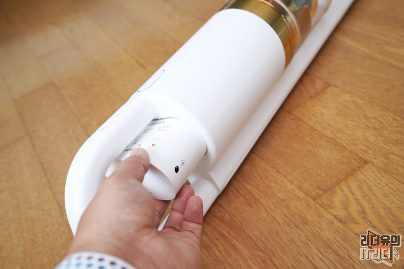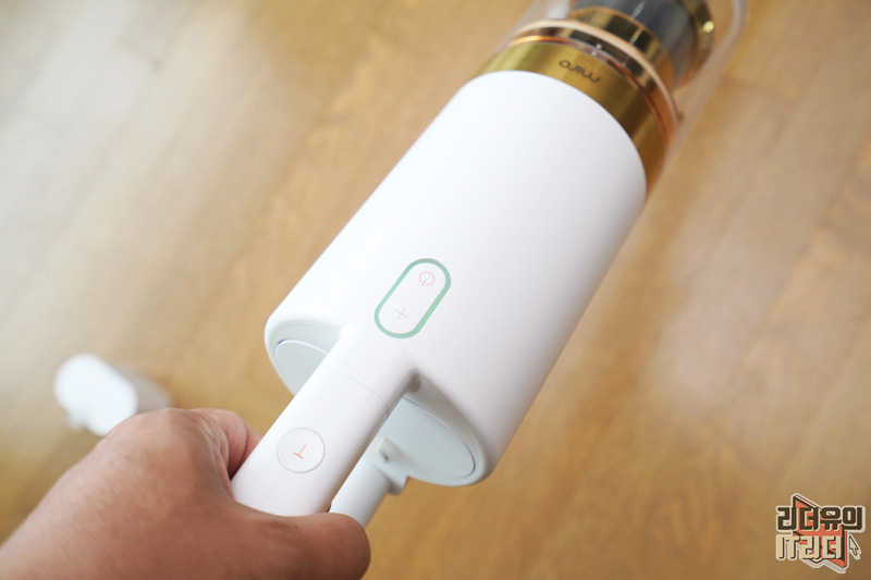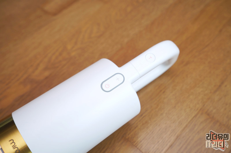 손잡이 영역에는 버튼이 위치해 있습니다. 전원 버튼과 진공 조절 버튼이 있고 위쪽에 T라고 되어 있는 버튼은 터보 버튼입니다.