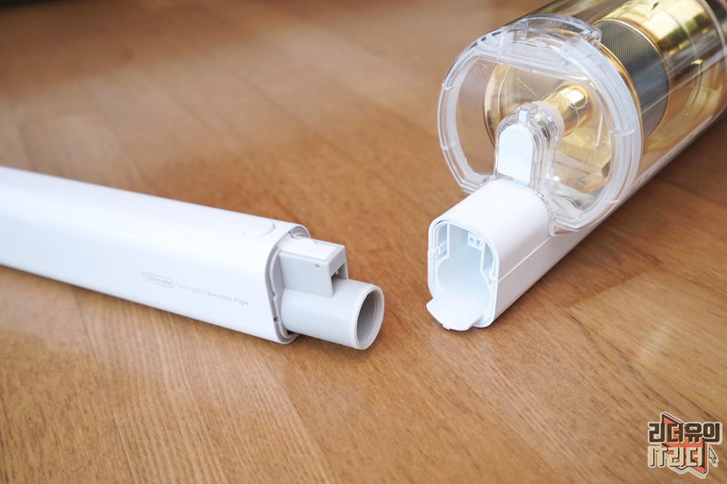 미로 더제로 s9 진공물걸레 무선청소기 연장관 연결 모습입니다. 파이프 옆에는 Ultmate Strength / Vacuum pipe라고 써 있습니다. 일반적인 플라스틱 소재가 아니라 ABS 초강력 소재를 사용해 큰 충격을 받아도 부러짐 현상 없이 사용할 수 있는 내구성을 갖췄습니다.