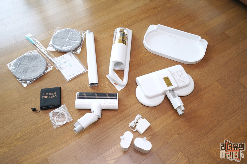 미로 더제로 s9 진공 물걸레 무선청소기 구성품은 본체, 연장관, 진공 물걸레 헤드, 진공 롤 헤드, 물걸레 패드 부착판, 물걸레 패드 4장, 배터리팩 2개, 충전 어댑터, 젠더, 파우치, 청소솔로 구성되어 있습니다.