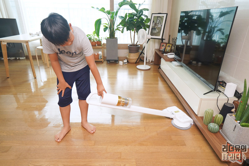 그립감 좋고 무게 배분도 좋아서 손목 부담 없이 청소를 편하게 할 수 있습니다. 인체 공학적으로 80도 손목 그립이 가능한 디자인입니다. 아이들도 사용할 수 있을 정도의 핸들링 입니다.