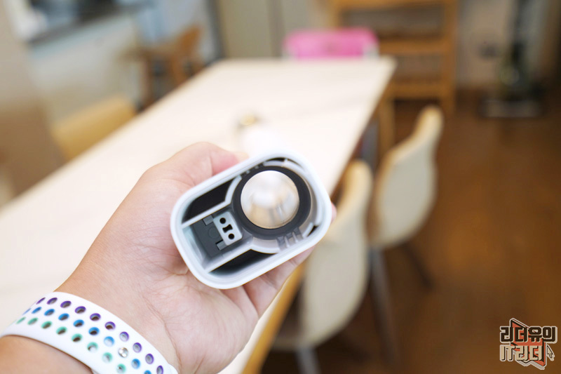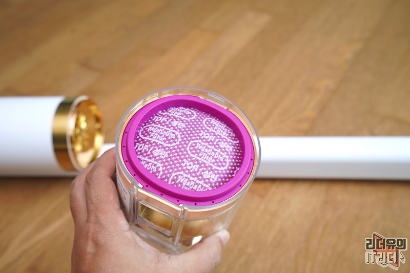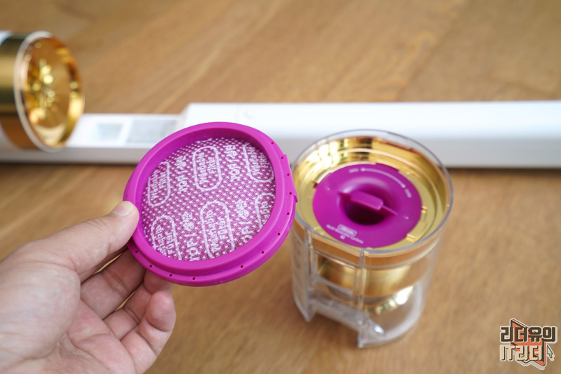 먼지통 위에는 마이크로 필터가 있습니다. 만져보면 도톰해서 완벽하게 걸러주고 있음을 느낄 수 있습니다. 물세척 가능합니다.