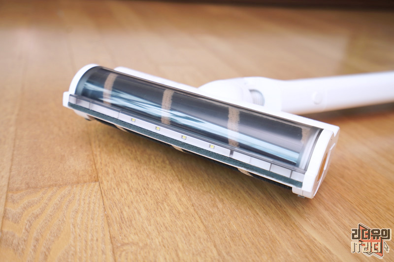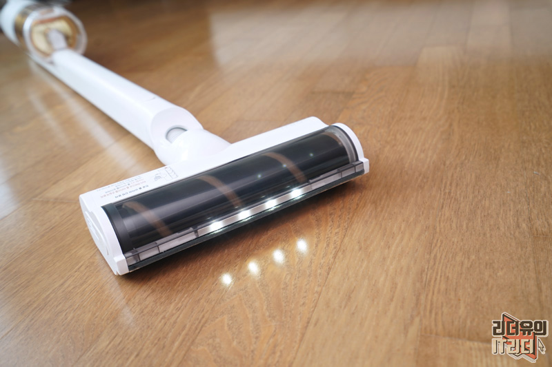 진공 롤 헤드를 장착한 모습입니다. 부드러운 소재의 헤드로 바닥 손상을 방지하고 강하게 돌아가는 회전력으로 최적의 청소를 할 수 있게 해줍니다. 그리고 머리카락이나 털이 엉키지 않는 것도 장점입니다.