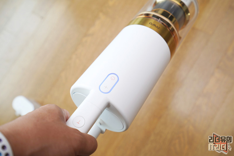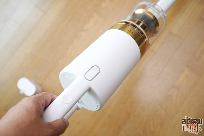 손잡이 영역에는 버튼이 위치해 있습니다. 전원 버튼과 진공 조절 버튼이 있고 위쪽에 T라고 되어 있는 버튼은 터보 버튼입니다.