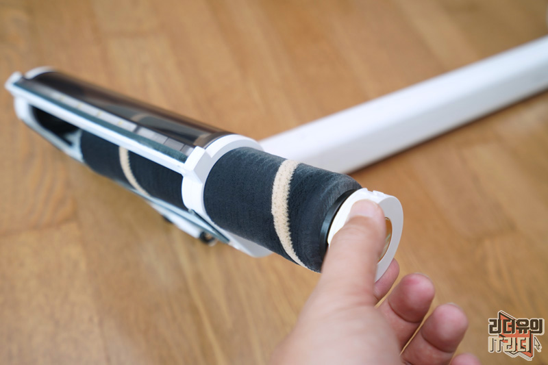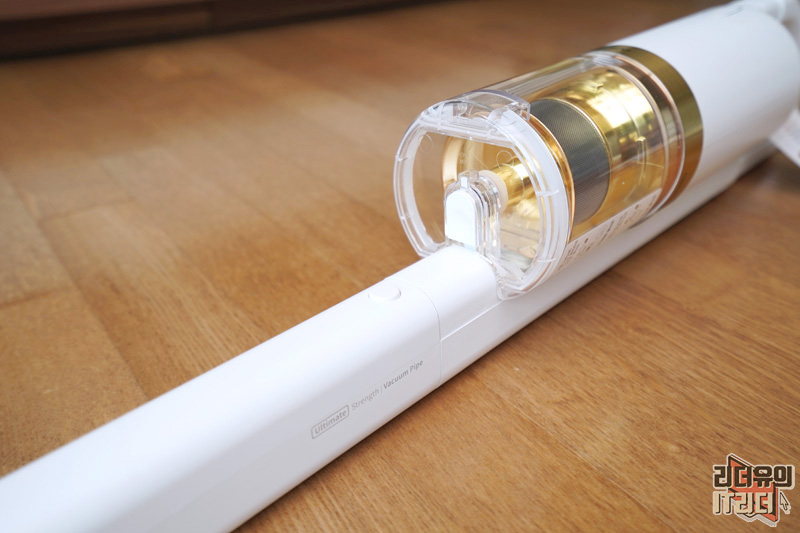 미로 더제로 s9 진공물걸레 무선청소기 연장관 연결 모습입니다. 파이프 옆에는 Ultmate Strength / Vacuum pipe라고 써 있습니다. 일반적인 플라스틱 소재가 아니라 ABS 초강력 소재를 사용해 큰 충격을 받아도 부러짐 현상 없이 사용할 수 있는 내구성을 갖췄습니다.