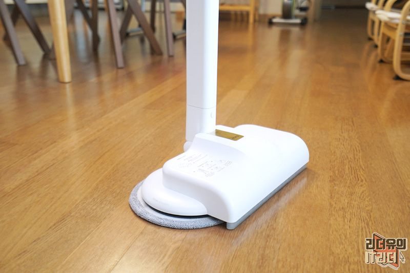 물걸레를 부착하면 이런 느낌입니다. 물걸레가 크기 때문에 청소를 빠르고 쉽게 할 수 있습니다. 분당 300rpm으로 초고속 회전하게 됩니다. 다른 물걸레 청소기 대비 더 빠르게 회전하기 때문에 실제 사용해 보시면 한번 지나가면 끝입니다. 힘 주지 않고 그냥 밀고 다니면 됩니다.