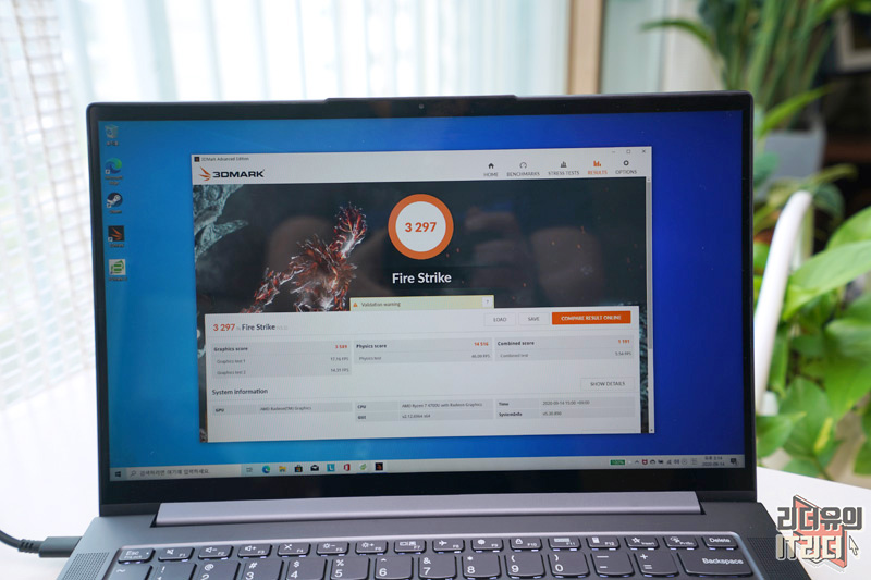 3DMARK Fire Strike 점수는 3297점이 나왔습니다. 그래픽 점수도 이 정도면 꽤 준수한 수준입니다. 슬림한 노트북임을 고려했을때 성능적인 부분에서 전혀 부족한점을 느낄 수 없을 것입니다.
