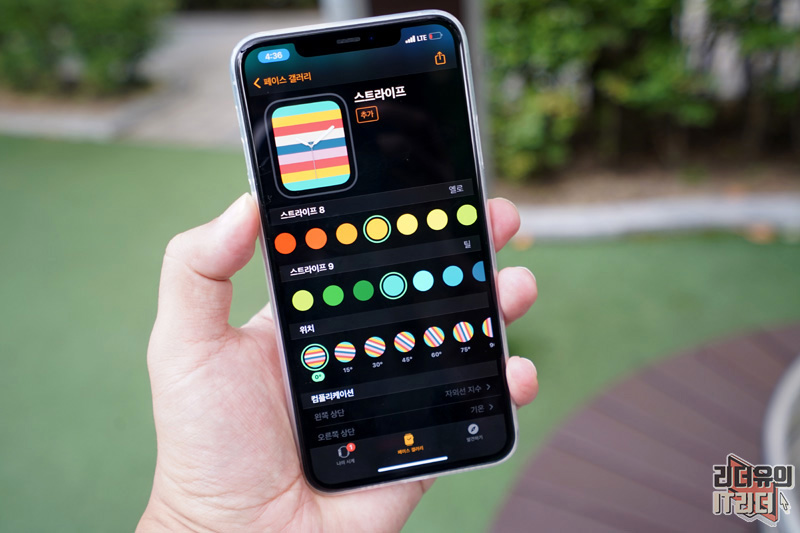 애플워치 스트라이프는 다양한 컬러 조합을 통해 색다른 워치 페이스를 만들 수 있습니다. 색상 개수, 사선 각도 다 세밀하게 조절할 수 있습니다.