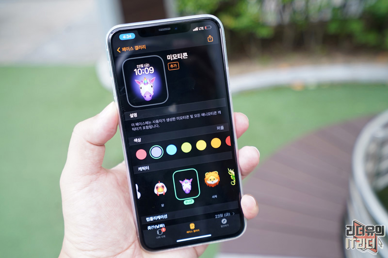 귀여운 캐릭터인 미모티콘과 자신이 만든 캐릭터를 워치페이스로 적용할 수 있습니다. 색상은 백그라운드 조명을 바꾸는 것이고 캐릭터를 다양하게 골라서 사용할 수 있습니다.