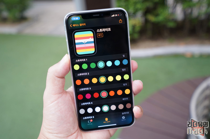 애플워치 스트라이프는 다양한 컬러 조합을 통해 색다른 워치 페이스를 만들 수 있습니다. 색상 개수, 사선 각도 다 세밀하게 조절할 수 있습니다.