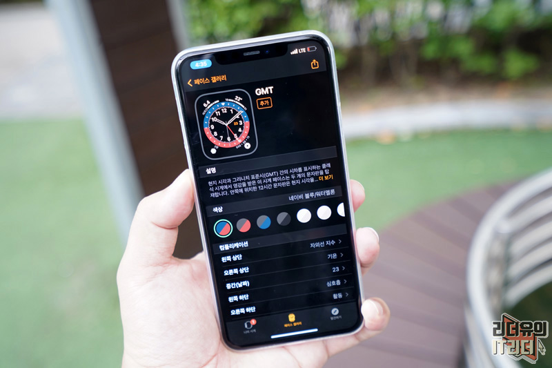 현재 시각과 그리니치 표준시(GMT) 간의 시차를 표시하는 클래식 워치에서 영감을 받은 워치페이스라고 합니다. 두개의 지역 시간을 볼 수 있어 해외에 갔을때 유용합니다. 참고로 두가지 색상이 적용된 워치페이스를 볼 수 있는데요. 기본 컬러에서 봤을때 어두운 곳은 밤 시간을 의미하는 것이고 빨간색은 낮시간을 의미하는 것입니다.