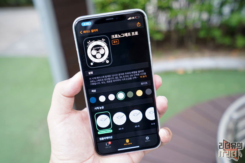 애플워치 크로노그래프 프로는 타키미터를 이용해 속도 측정이 가능한 워치페이스 입니다. 특수한 워치페이스까지 애플워치는 다 섭렵하고 있습니다. 색상, 시계 눈금을 설정해 원하는 모드로 사용할 수 있습니다.