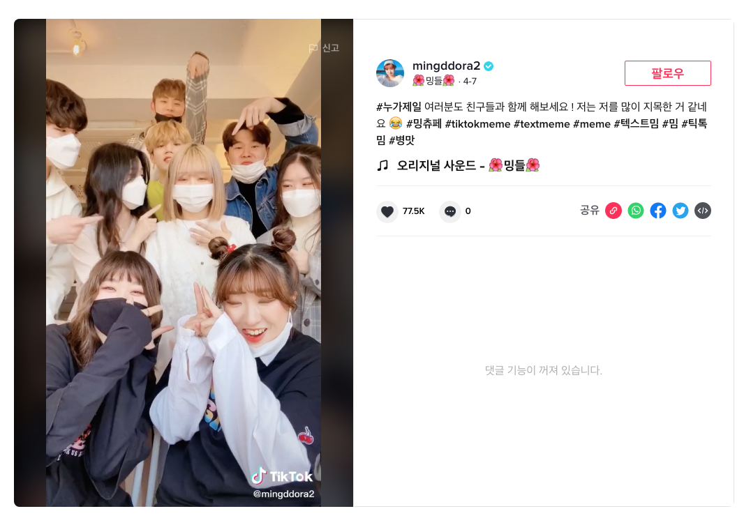 틱톡에서는 요즘 친구들과 단체놀이를 하는 것을 많이 봅니다. 숏폼으로 만드는 영상이라 금방 만들 수 있어 좋고 성공했을때 추억도 되고 하니 여러분도 만들어 보시면 좋은 추억을 남길 수 있을 것 같습니다.