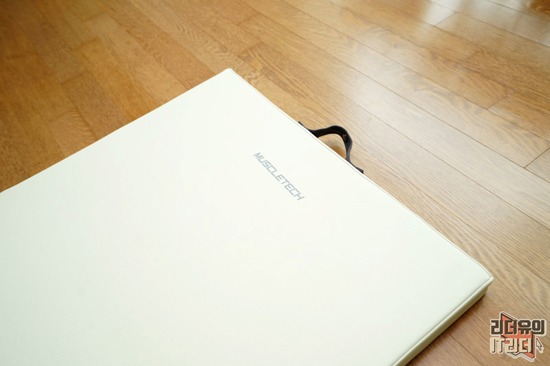 매트 위에는 머슬테크 브랜드가 새겨져 있습니다. 참고로 이런 요가매트의 경우 중국 제조가 많은데요. 머슬테크는 국내 제조로 만들어지는 믿을 수 있는 제품입니다. 외피, 내부 폼, 지퍼까지도 최상의 제품을 만들기 위해 노력하고 있다고 하고 피부에 닿는 제품이기 때문에 검증된 원단을 사용한다고 합니다. 저렴한 요가 매트와 확실한 차이를 느낄 수 있는 부분입니다.