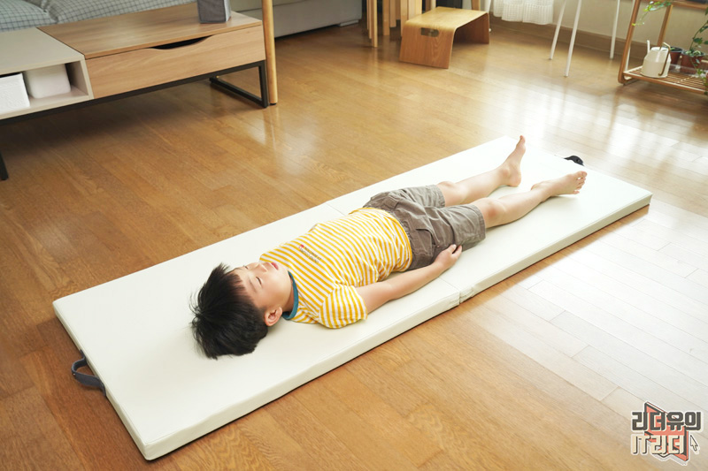 아이가 누운 모습입니다. 1인용 침대 같죠? 도톰한 두께라 딱딱한 바닥 대신 편안하게 누울 수 있습니다. 요즘 차박도 유행인데 차에 깔고 누워도 좋을 것 같습니다.
