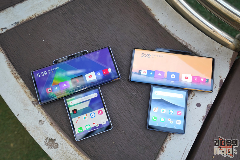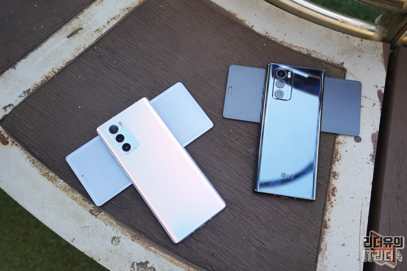 LG 윙의 변신 모습입니다. 세컨드 스크린에도 일루전 스카이는 블루라인이 보이고 있고 오로라 그레이는 선이 없는 깔끔함을 보여줍니다.