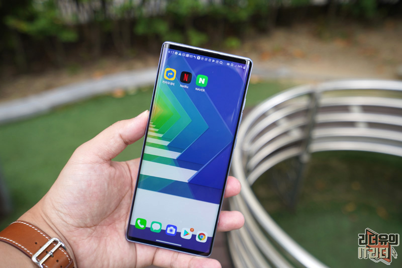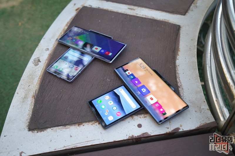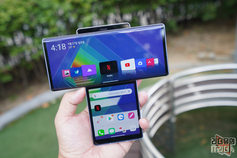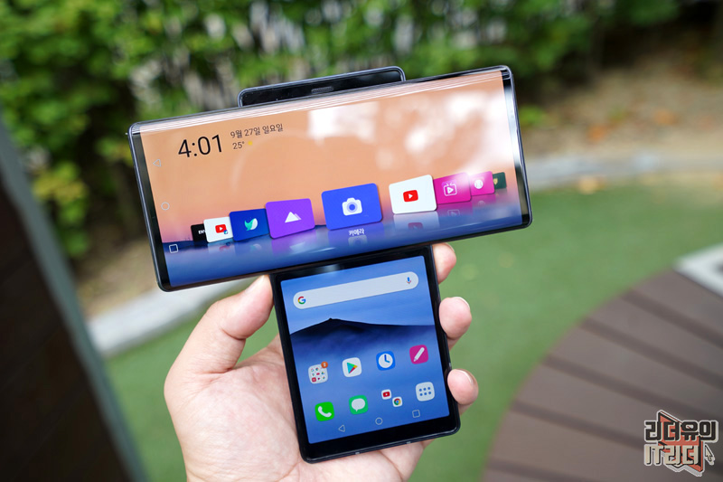 LG 윙의 변신 모습입니다. 세컨드 스크린에도 일루전 스카이는 블루라인이 보이고 있고 오로라 그레이는 선이 없는 깔끔함을 보여줍니다.